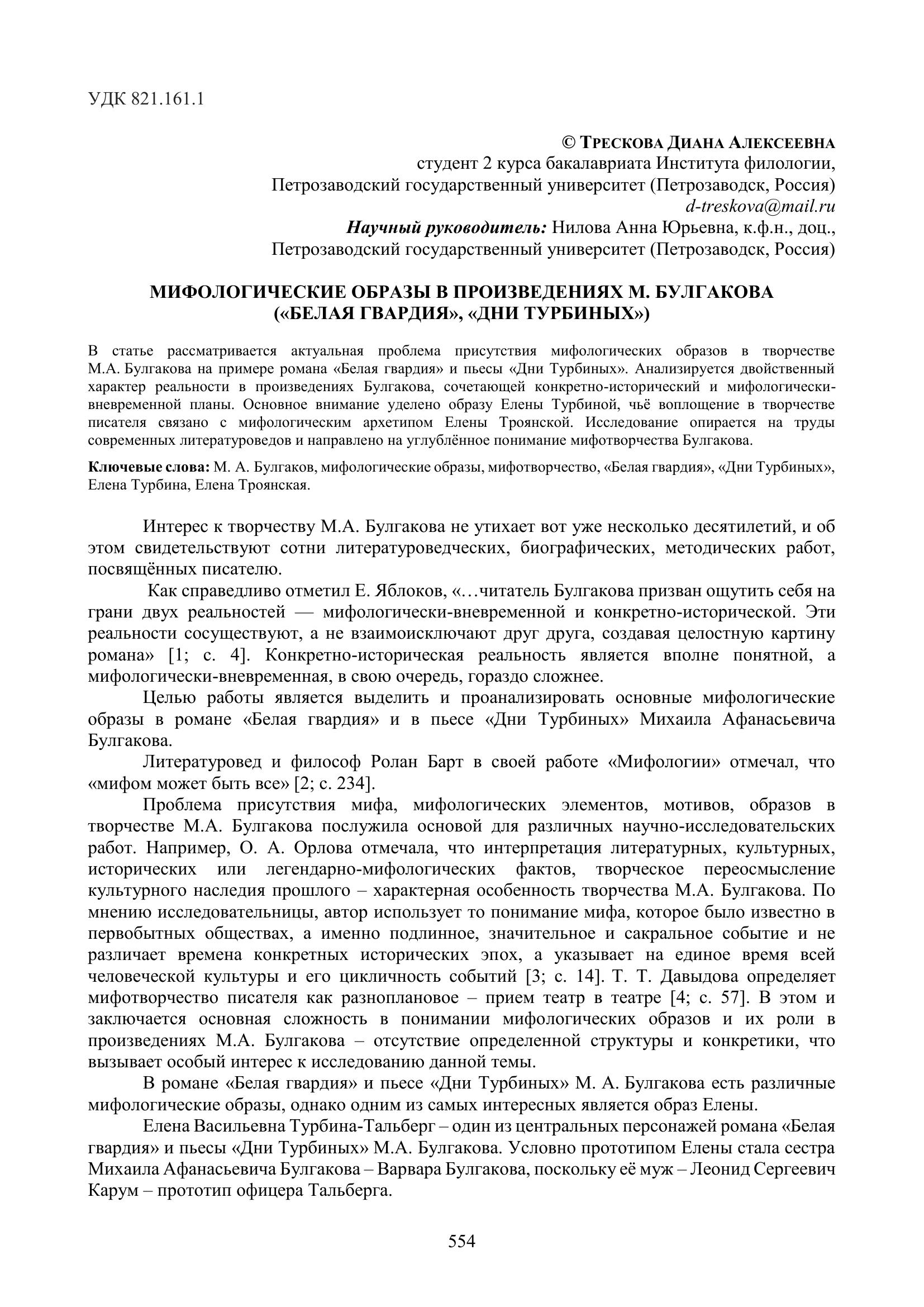 В статье рассматривается актуальная проблема присутствия мифологических образов в творчестве М. А. Булгакова на примере романа «Белая гвардия» и пьесы «Дни Турбиных». Анализируется двойственный характер реальности в произведениях Булгакова, сочетающей конкретно-исторический и мифологически-вневременной планы. Основное внимание уделено образу Елены Турбиной, чье воплощение в творчестве писателя связано с мифологическим архетипом Елены Троянской. Исследование опирается на труды современных литературоведов и направлено на углубленное понимание мифотворчества Булгакова.