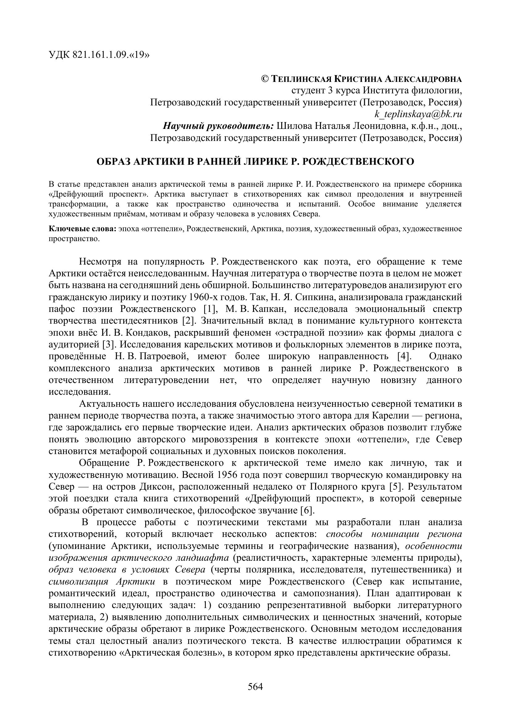 Теплинская К. А. Образ Арктики в ранней лирике Р. Рождественского / К. А. Теплинская. — Текст : электронный // Научно-исследовательская работа обучающихся и молодых учёных: материалы 77-й Всероссийской (с международным участием) научной конференции обучающихся и молодых учёных, посвящённой 85-летию ПетрГУ и 80-летию Победы в Великой Отечественной войне (г. Петрозаводск, 31 марта – 27 апреля 2025 года). — Петрозаводск : Изд-во ПетрГУ, 2025. — С. 564-566. — URL: http://elibrary.petrsu.ru/books/80726 (дата обращения: 05.12.2025)