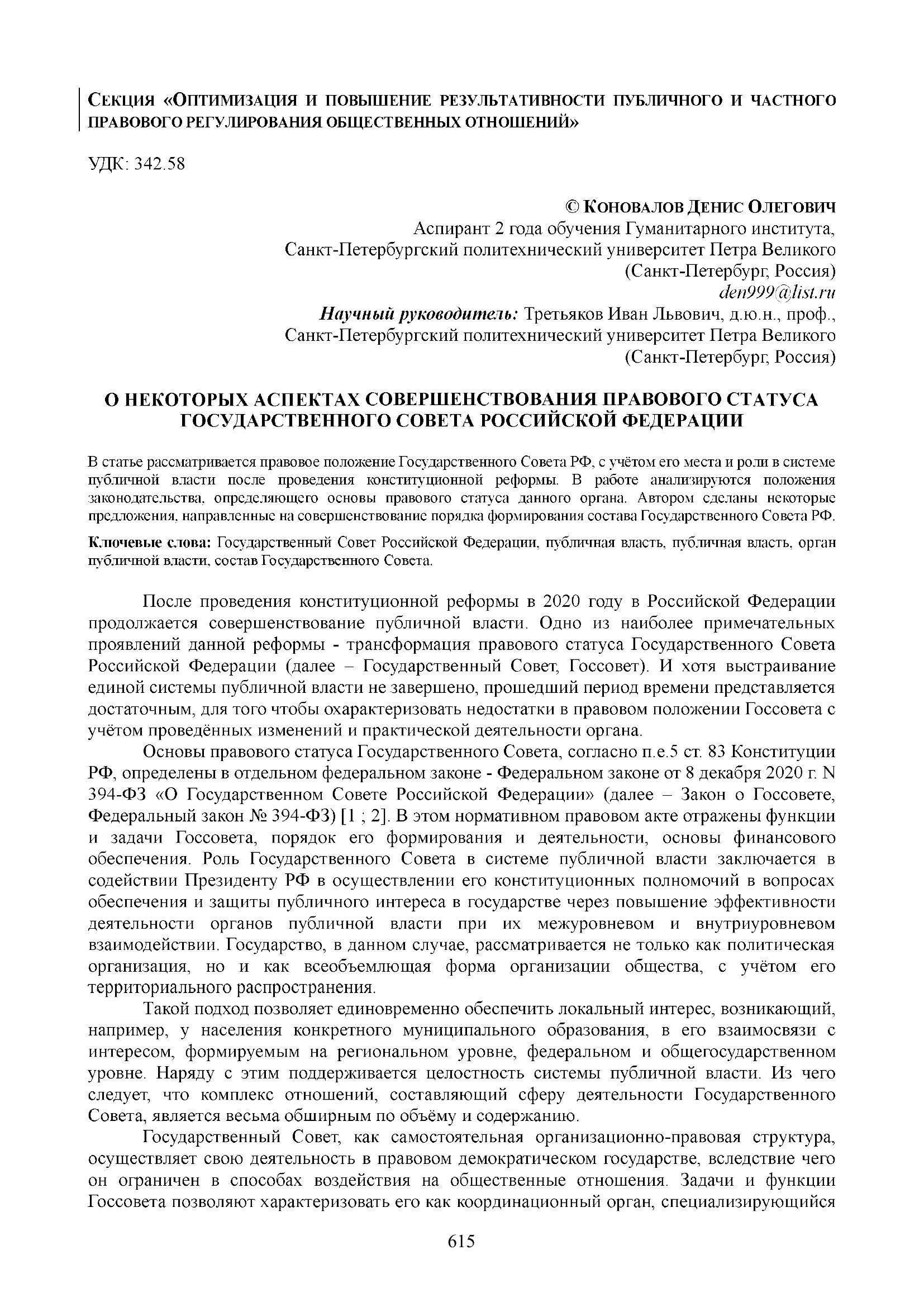Коновалов Д. О. О некоторых аспектах совершенствования правового статуса Государственного Совета Российской Федерации / Д. О. Коновалов. — Текст : электронный // Научно-исследовательская работа обучающихся и молодых учёных: материалы 77-й Всероссийской (с международным участием) научной конференции обучающихся и молодых учёных, посвящённой 85-летию ПетрГУ и 80-летию Победы в Великой Отечественной войне (г. Петрозаводск, 31 марта – 27 апреля 2025 года). — Петрозаводск : Изд-во ПетрГУ, 2025. — С. 615-617. — URL: http://elibrary.petrsu.ru/books/80770 (дата обращения: 05.12.2025)