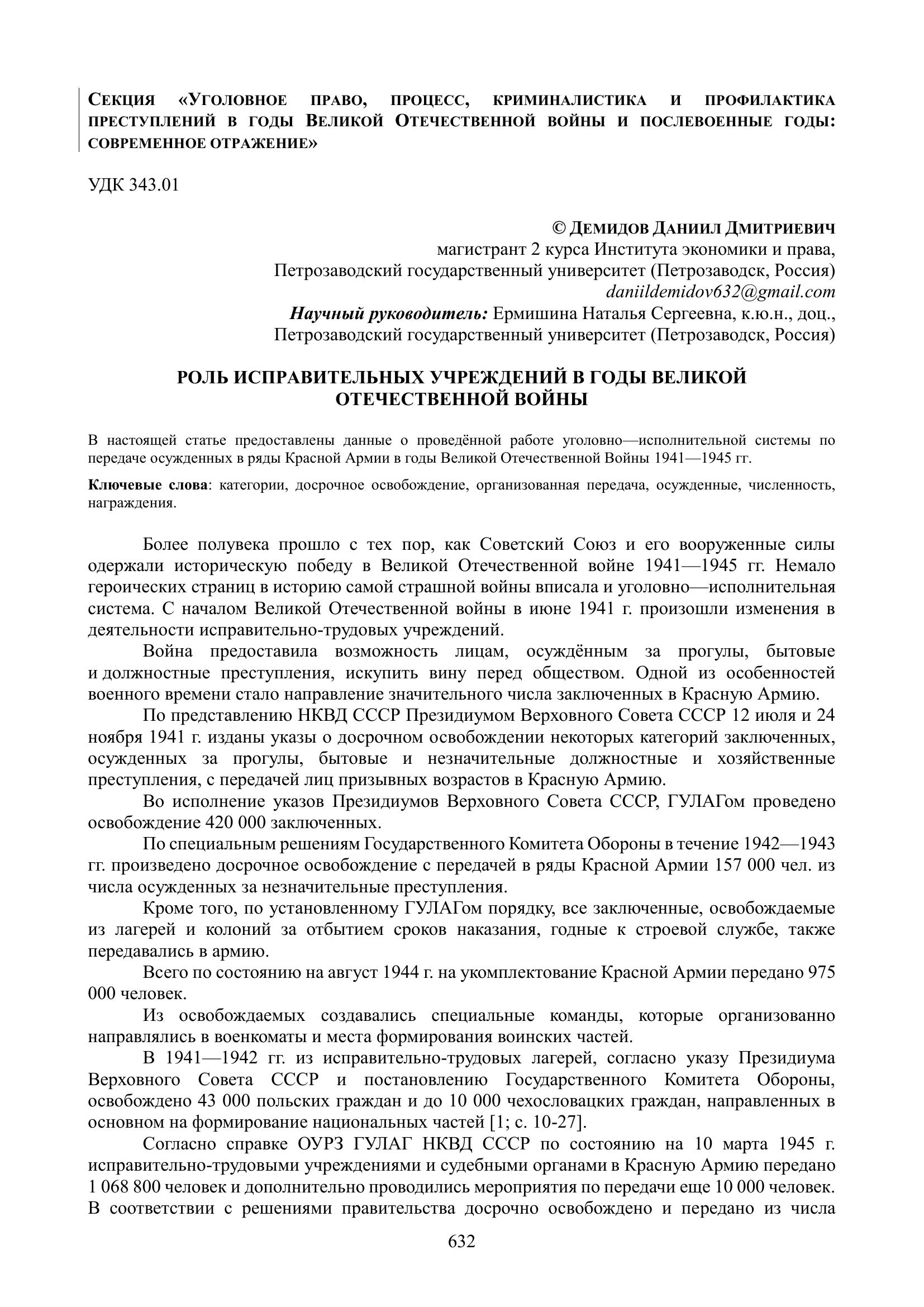 Демидов Д. Д. Роль исправительных учреждений в годы Великой Отечественной войны / Д. Д. Демидов. — Текст : электронный // Научно-исследовательская работа обучающихся и молодых учёных: материалы 77-й Всероссийской (с международным участием) научной конференции обучающихся и молодых учёных, посвящённой 85-летию ПетрГУ и 80-летию Победы в Великой Отечественной войне (г. Петрозаводск, 31 марта – 27 апреля 2025 года). — Петрозаводск : Изд-во ПетрГУ, 2025. — С. 632-634 — URL: http://elibrary.petrsu.ru/books/80844 (дата обращения: 05.12.2025)