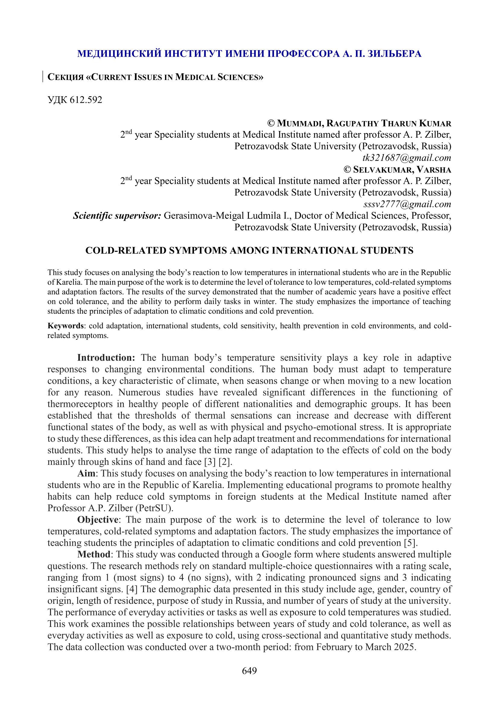 This study focuses on analysing the body’s reaction to low temperatures in international students who are in the Republic of Karelia. The main purpose of the work is to determine the level of tolerance to low temperatures, cold-related symptoms and adaptation factors. The results of the survey demonstrated that the number of academic years have a positive effect on cold tolerance, and the ability to perform daily tasks in winter. The study emphasizes the importance of teaching students the principles of adaptation to climatic conditions and cold prevention.