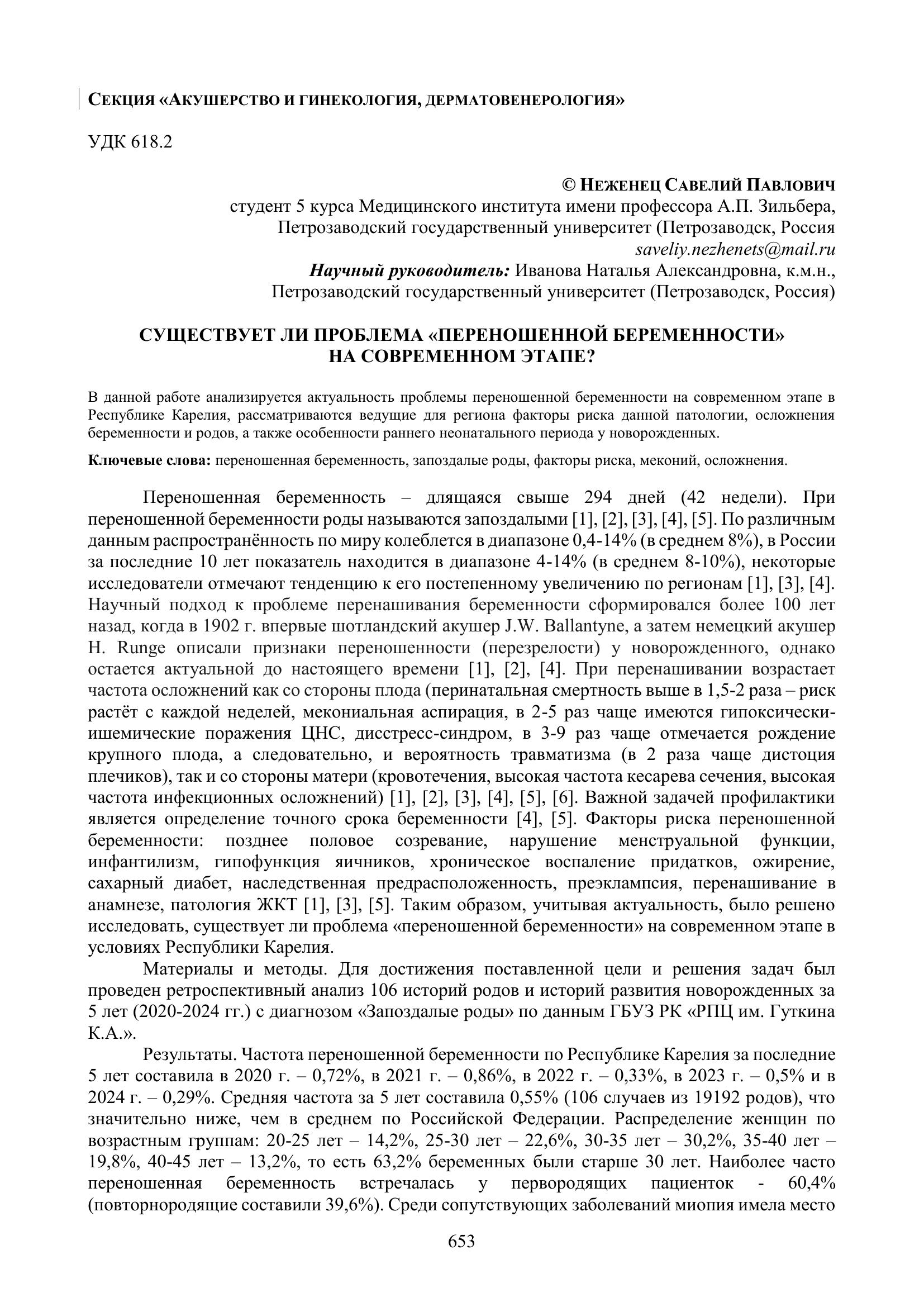 Неженец С. П. Существует ли проблема «переношенной беременности» на современном этапе? / С. П. Неженец. — Текст : электронный // Научно-исследовательская работа обучающихся и молодых учёных: материалы 77-й Всероссийской (с международным участием) научной конференции обучающихся и молодых учёных, посвящённой 85-летию ПетрГУ и 80-летию Победы в Великой Отечественной войне (г. Петрозаводск, 31 марта – 27 апреля 2025 года). — Петрозаводск : Изд-во ПетрГУ, 2025. — С. 653-655. — URL: http://elibrary.petrsu.ru/books/80924 (дата обращения: 05.12.2025)