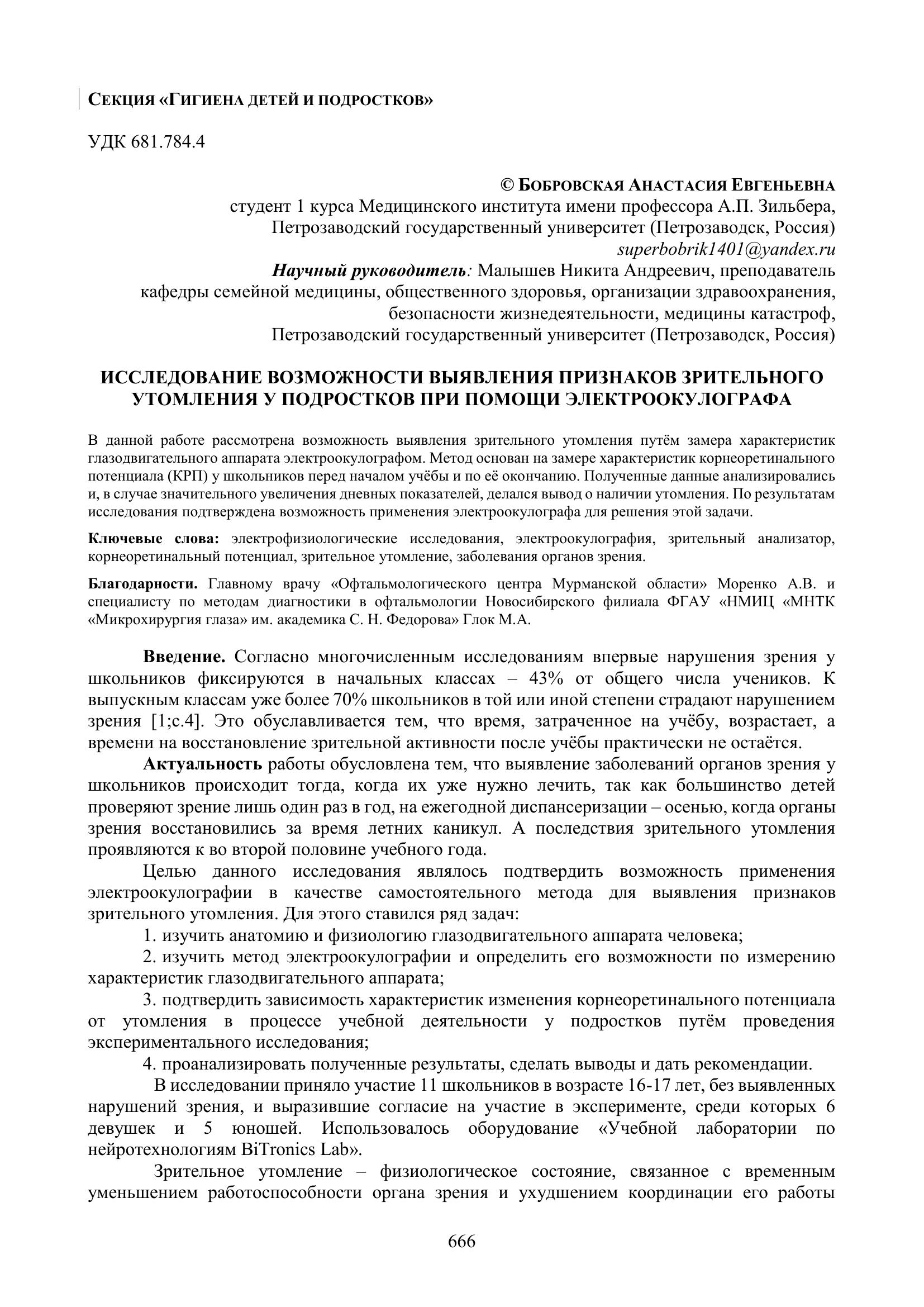 Исследование возможности выявления признаков зрительного утомления у подростков при помощи электроокулографа