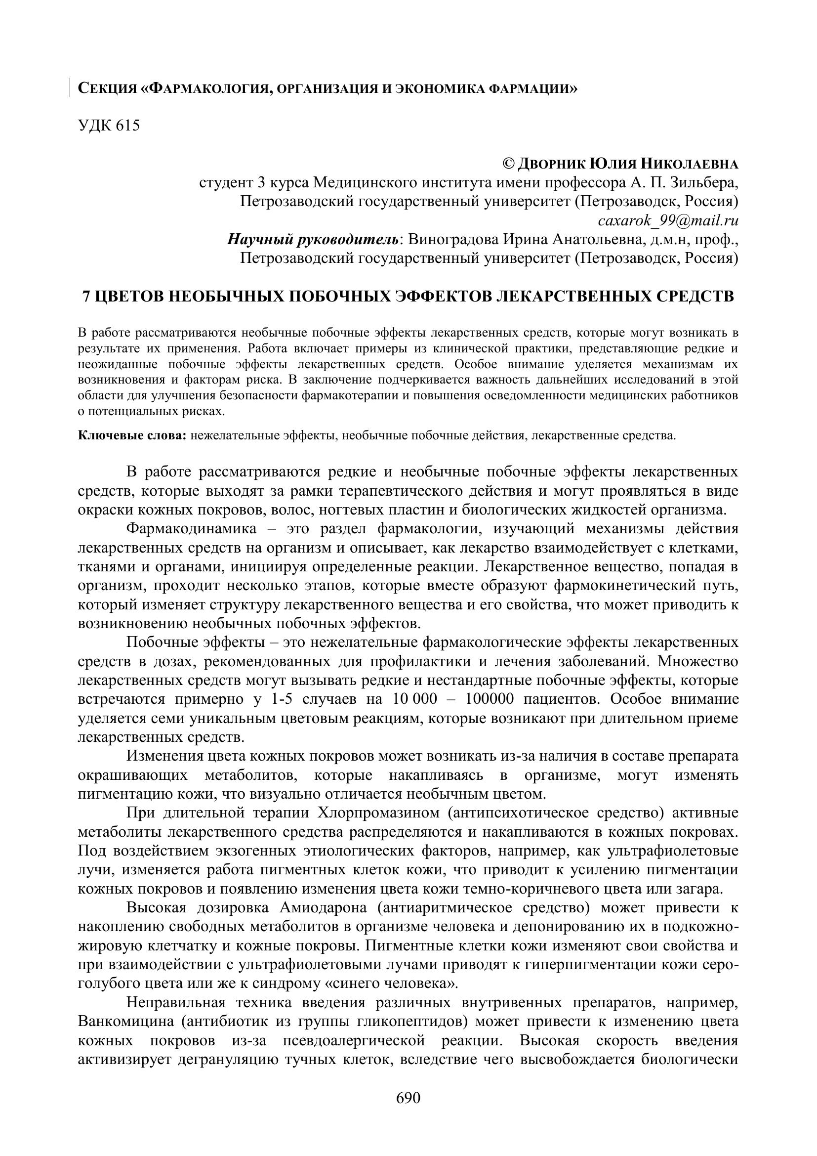 В работе рассматриваются необычные побочные эффекты лекарственных средств, которые могут возникать в результате их применения. Работа включает примеры из клинической практики, представляющие редкие и неожиданные побочные эффекты лекарственных средств. Особое внимание уделяется механизмам их возникновения и факторам риска. В заключение подчеркивается важность дальнейших исследований в этой области для улучшения безопасности фармакотерапии и повышения осведомленности медицинских работников о потенциальных рисках.