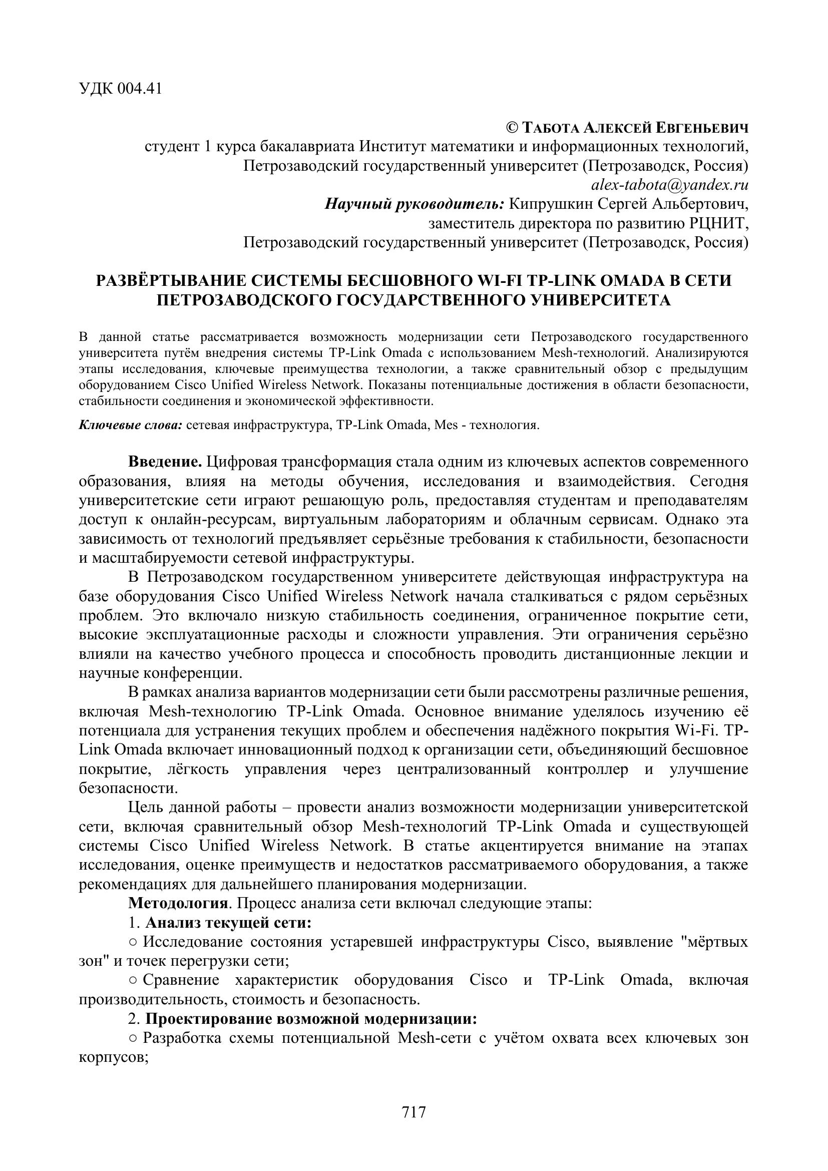 В данной статье рассматривается возможность модернизации сети Петрозаводского государственного университета путём внедрения системы TP-Link Omada с использованием Mesh-технологий. Анализируются этапы исследования, ключевые преимущества технологии, а также сравнительный обзор с предыдущим оборудованием Cisco Unified Wireless Network. Показаны потенциальные достижения в области безопасности, стабильности соединения и экономической эффективности.