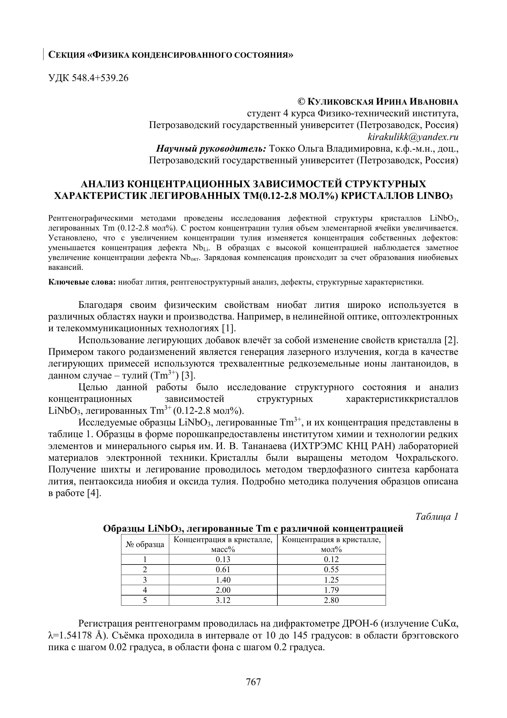 Анализ концентрационных зависимостей структурных характеристик легированных Tm(0.12-2.8 мол%) кристаллов LiNbO3