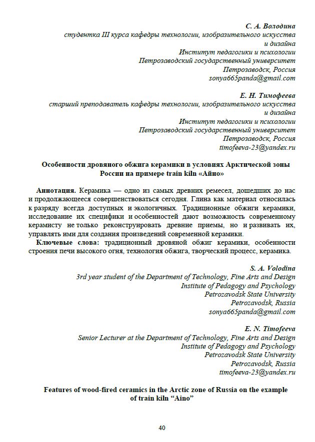 Особенности дровяного обжига керамики в условиях Арктической зоны России на примере train kiln «Айно»Нилова Ольга Константиновна