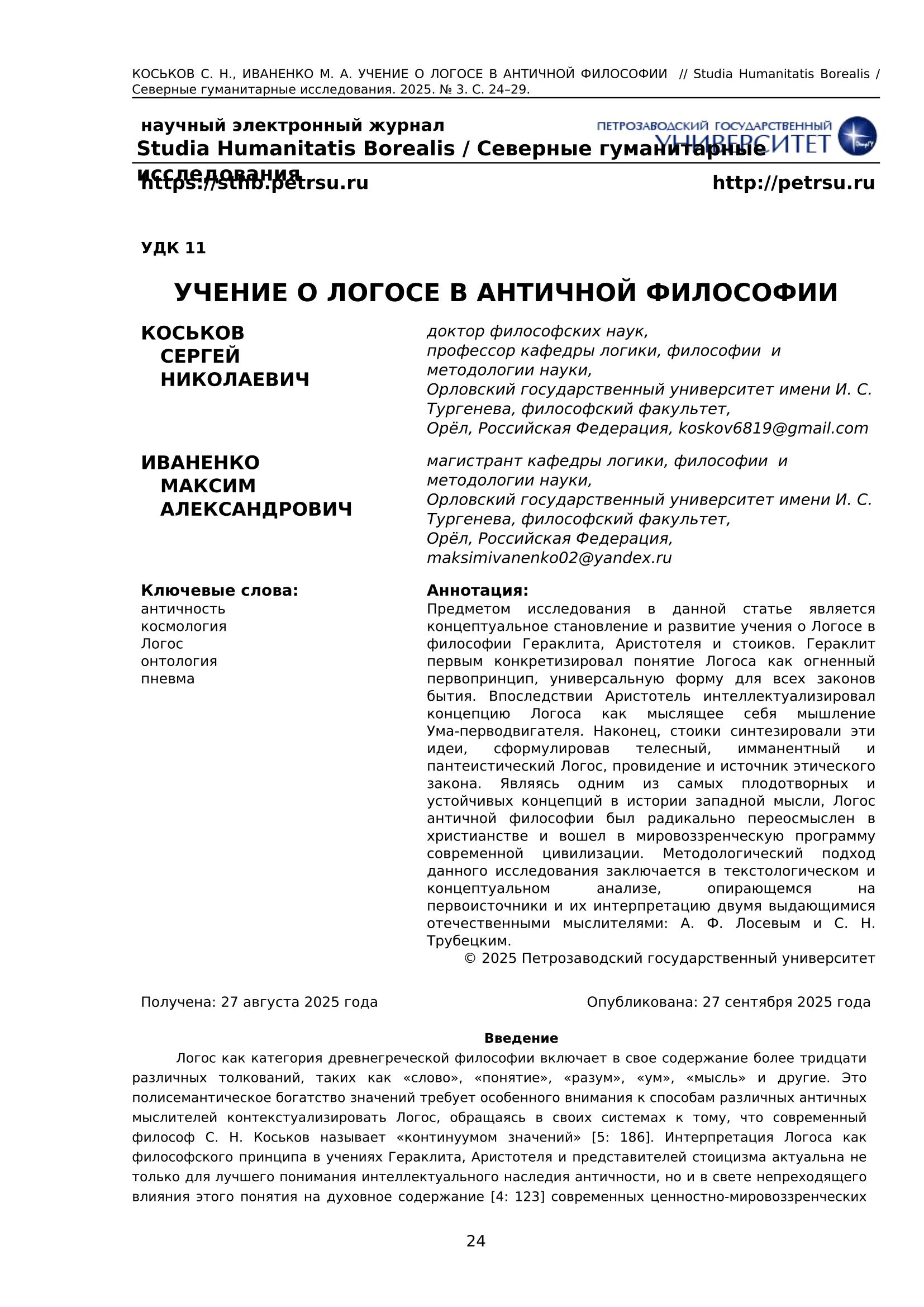 Предметом исследования в данной статье является концептуальное становление и развитие учения о Логосе в философии Гераклита, Аристотеля и стоиков. Гераклит первым конкретизировал понятие Логоса как огненный первопринцип, универсальную форму для всех законов бытия. Впоследствии Аристотель интеллектуализировал концепцию Логоса как мыслящее себя мышление Ума-перводвигателя. Наконец, стоики синтезировали эти идеи, сформулировав телесный, имманентный и пантеистический Логос, провидение и источник этического закона. Являясь одним из самых плодотворных и устойчивых концепций в истории западной мысли, Логос античной философии был радикально переосмыслен в христианстве и вошел в мировоззренческую программу современной цивилизации. Методологический подход данного исследования заключается в текстологическом и концептуальном анализе, опирающемся на первоисточники и их интерпретацию двумя выдающимися отечественными мыслителями: А. Ф. Лосевым и С. Н. Трубецким.