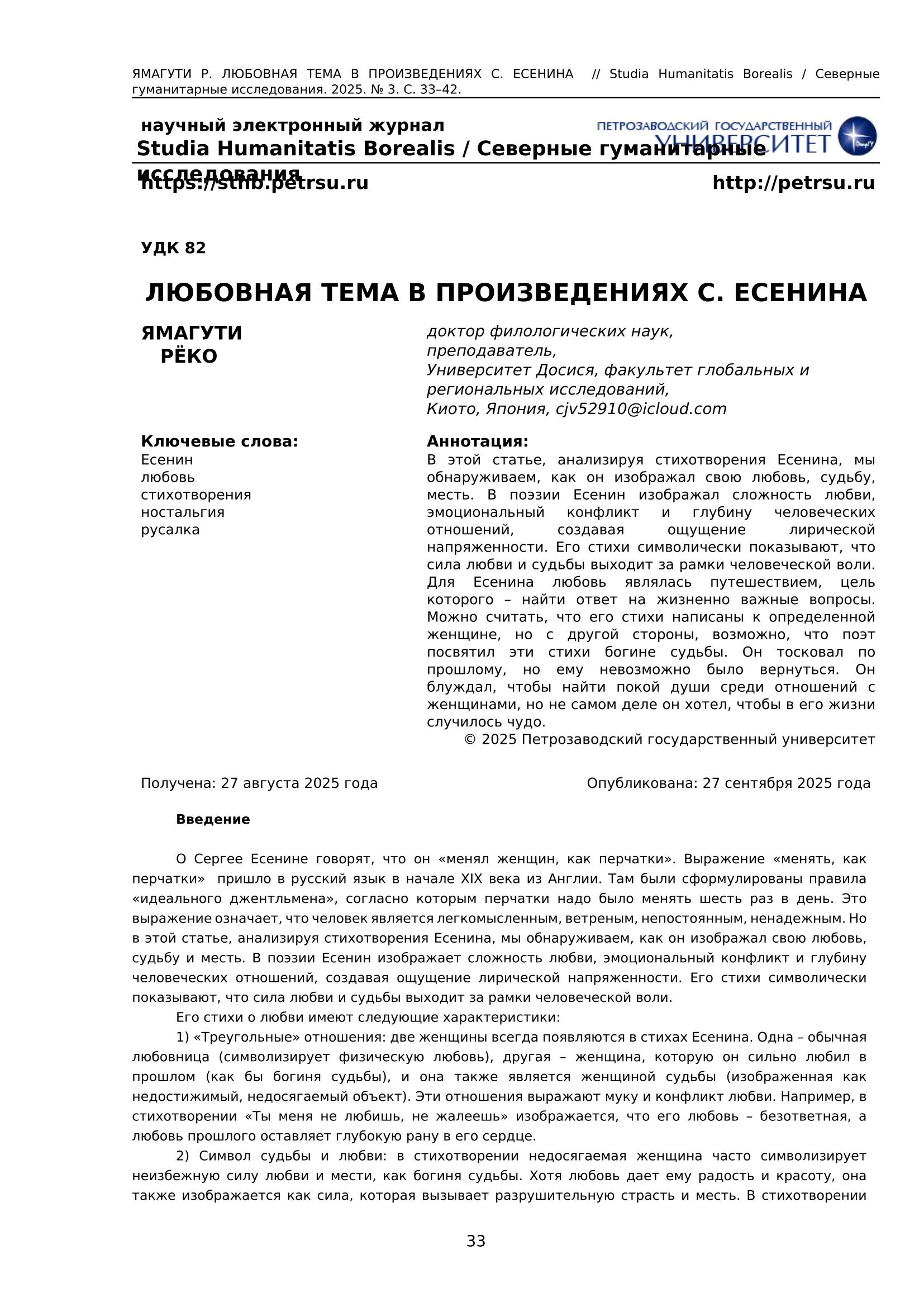 В этой статье, анализируя стихотворения Есенина, мы обнаруживаем, как он изображал свою любовь, судьбу, месть. В поэзии Есенин изображал сложность любви, эмоциональный конфликт и глубину человеческих отношений, создавая ощущение лирической напряженности. Его стихи символически показывают, что сила любви и судьбы выходит за рамки человеческой воли. Для Есенина любовь являлась путешествием, цель которого – найти ответ на жизненно важные вопросы. Можно считать, что его стихи написаны к определенной женщине, но с другой стороны, возможно, что поэт посвятил эти стихи богине судьбы. Он тосковал по прошлому, но ему невозможно было вернуться. Он блуждал, чтобы найти покой души среди отношений с женщинами, но не самом деле он хотел, чтобы в его жизни случилось чудо.