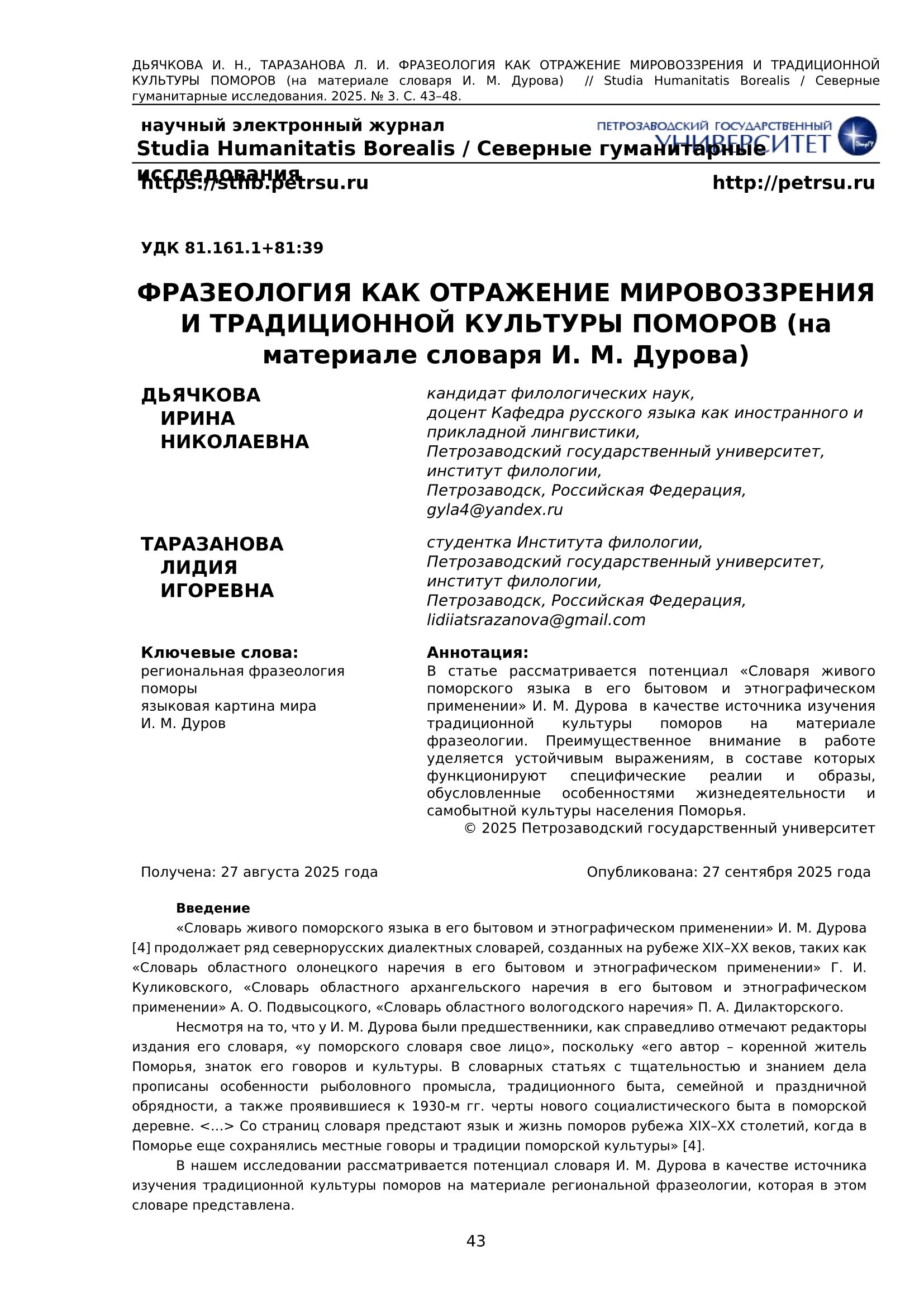 Фразеология как отражение мировоззрения и традиционной культуры поморов (на материале словаря И. М. Дурова)