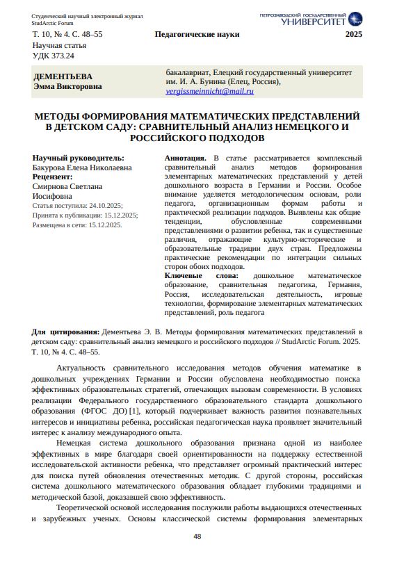 Методы формирования математических представлений в детском саду: сравнительный анализ немецкого и российского подходовКазьмина Екатерина Денисовна