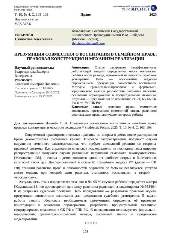 Статья раскрывает неэффективность действующей модели определения места жительства ребёнка после развода, основанной на широком судебном усмотрении. Цель – обоснование введения опровержимой презумпции совместного воспитания. Методом сравнительно-правового и формально-юридического анализа разработаны закрытый перечень оснований опровержения и процессуальный механизм. Результат – предложения по изменению ст. 24, 65–66 СК РФ и ст. 79 ГПК РФ.