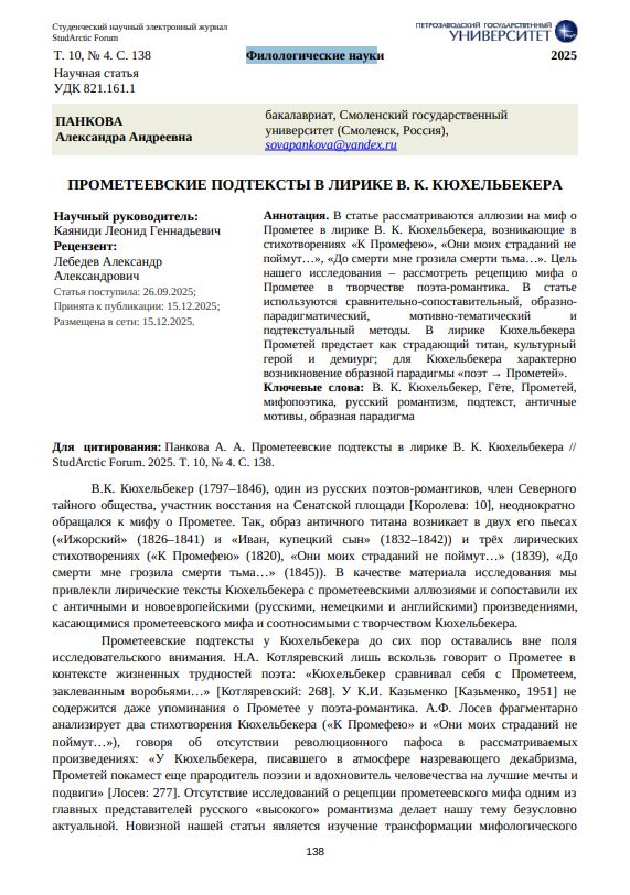 В статье рассматриваются аллюзии на миф о Прометее в лирике В. К. Кюхельбекера, возникающие в стихотворениях «К Промефею», «Они моих страданий не поймут…», «До смерти мне грозила смерти тьма…». Цель нашего исследования – рассмотреть рецепцию мифа о Прометее в творчестве поэта-романтика. В статье используются сравнительно-сопоставительный, образно-парадигматический, мотивно-тематический и подтекстуальный методы. В лирике Кюхельбекера Прометей предстает как страдающий титан, культурный герой и демиург; для Кюхельбекера характерно возникновение образной парадигмы «поэт → Прометей».