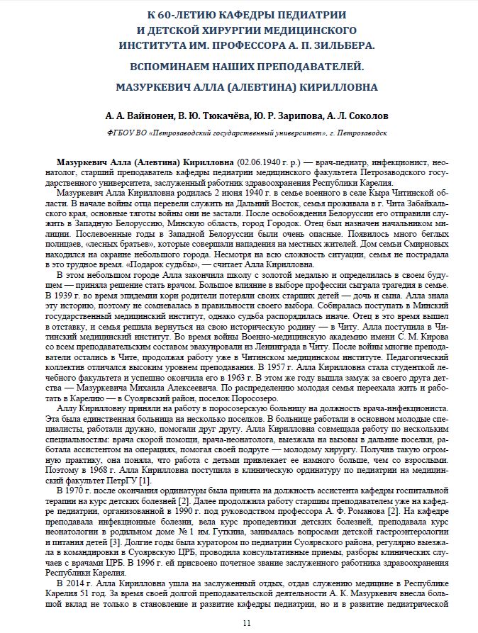 К 60-летию кафедры педиатрии и детской хирургии Медицинского института им. профессора А. П. Зильбера. Вспоминаем наших преподавателей. Мазуркевич Алла (Алевтина) Кирилловна