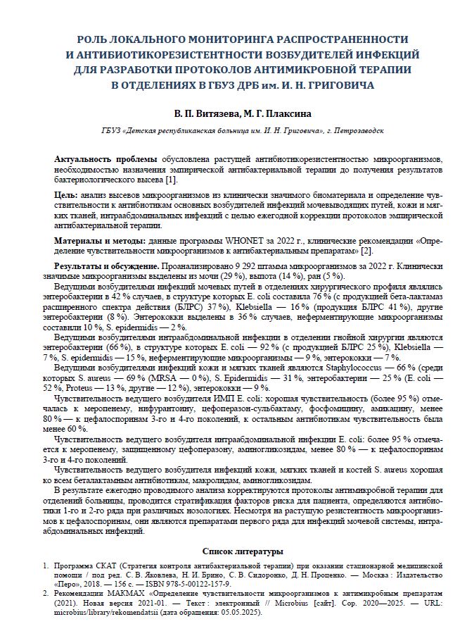 Роль локального мониторинга распространенности и антибиотикорезистентности возбудителей инфекций для разработки протоколов антимикробной терапии в отделениях в ГБУЗ ДРБ им. И. Н. Григовича