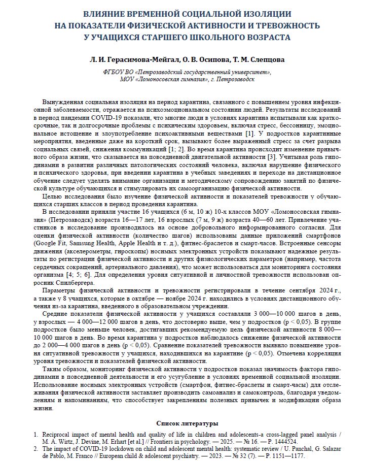 Влияние временной социальной изоляции на показатели физической активности и тревожность у учащихся старшего школьного возраста