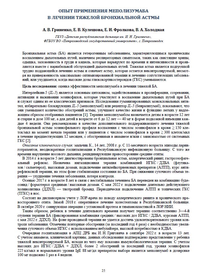 Опыт применения меполизумаба в лечении тяжелой бронхиальной астмыГриненко Алина Викторовна, Кулешова Елена Валерьевна, Фролкова Екатерина Ивановна, Холодная Варвара Андреевна