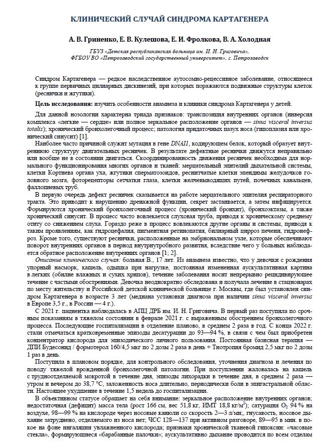 Клинический случай синдрома КартагенераГрязина Екатерина Максимовна, Варламова Татьяна Валентиновна