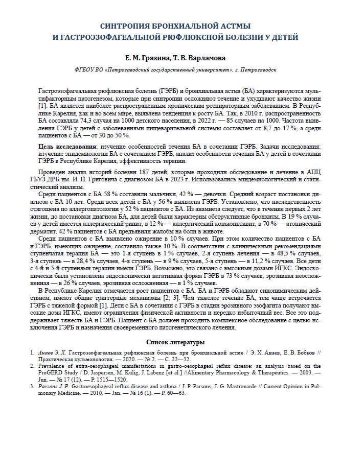 Синтропия бронхиальной астмы и гастроэзофагеальной рюфлюксной болезни у детей