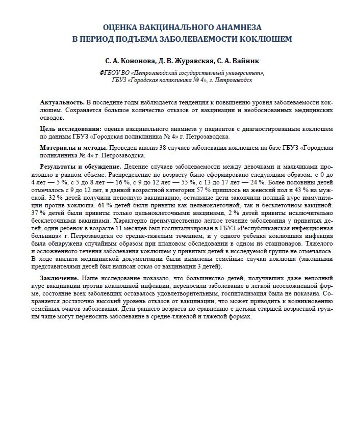 Оценка вакцинального анамнеза в период подъема заболеваемости коклюшемКостенко Галина Евгеньевна, Карманова Наталья Юрьевна, Иванов Павел Андреевич