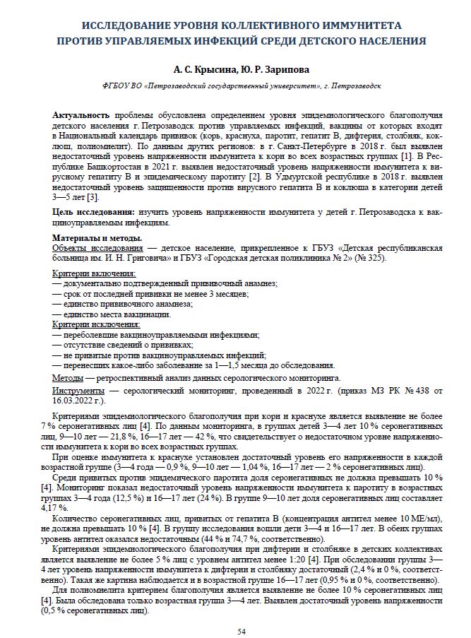 Исследование уровня коллективного иммунитета против управляемых инфекций среди детского населенияЛеухин Михаил Викторович, Вишневская Анна Владимировна
