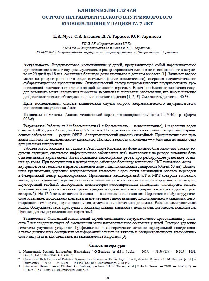 Цель исследования: описать клинический случай острого нетравматического внутримозгового кровоизлияния у ребенка 7 лет.