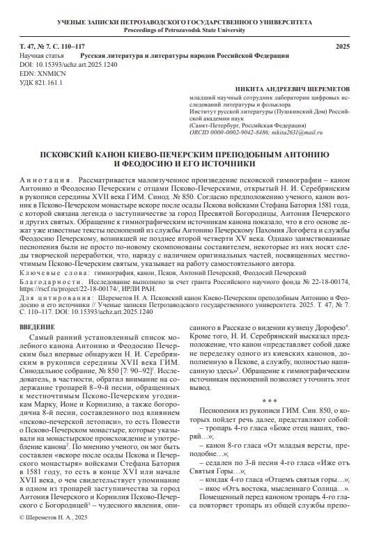 Рассматривается малоизученное произведение псковской гимнографии – канон Антонию и Феодосию Печерским с отцами Псково-Печерскими, открытый Н. И. Серебрянским в рукописи середины XVII века ГИМ. Синод. № 850. Согласно предположению ученого, канон возник в Псково-Печерском монастыре вскоре после осады Пскова войсками Стефана Батория 1581 года, с которой связана легенда о заступничестве за город Пресвятой Богородицы, Антония Печерского и других святых.