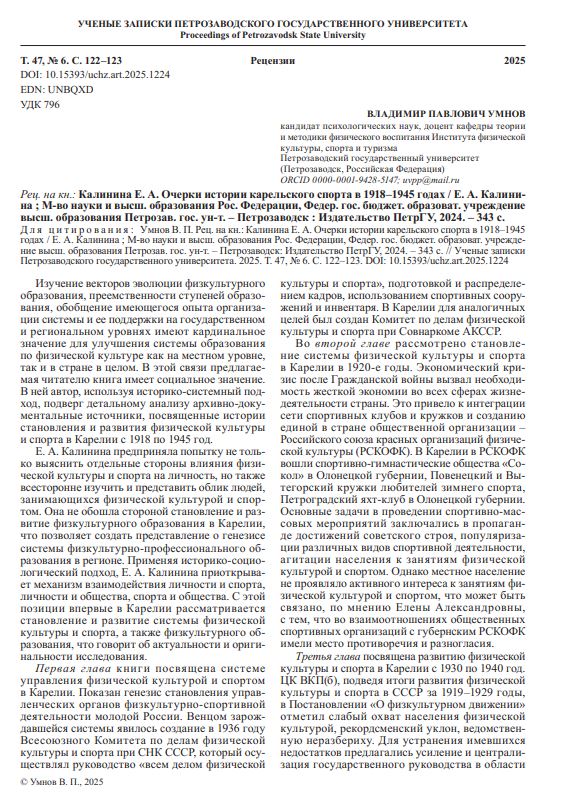 Рец. на кн.: Калинина Е. А. Очерки истории карельского спорта в 1918–1945 годах / Е. А. Калинина ; М-во науки и высш. образования Рос. Федерации, Федер. гос. бюджет. образоват. учреждение высш. образования Петрозав. гос. ун-т. – Петрозаводск: Издательство ПетрГУ, 2024. – 343 с.