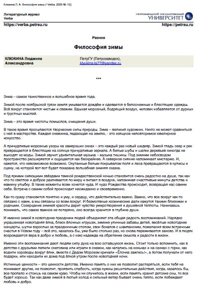 Зимой после ноябрьской грязи земля умывается дождём и одевается в белоснежные и блестящие одежды. Всё вокруг становится чистым и свежим. Вдыхая морозный, бодрящий воздух, человек избавляется от дурных и грустных мыслей.