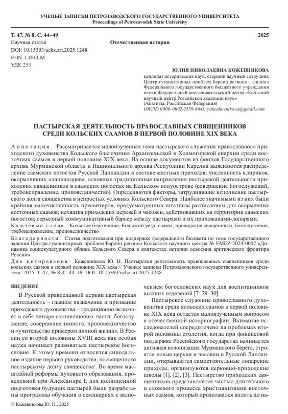 Рассматривается малоизученная тема пастырского служения православного приходского духовенства Кольского благочиния Архангельской и Холмогорской епархии среди восточных саамов в первой половине XIX века.