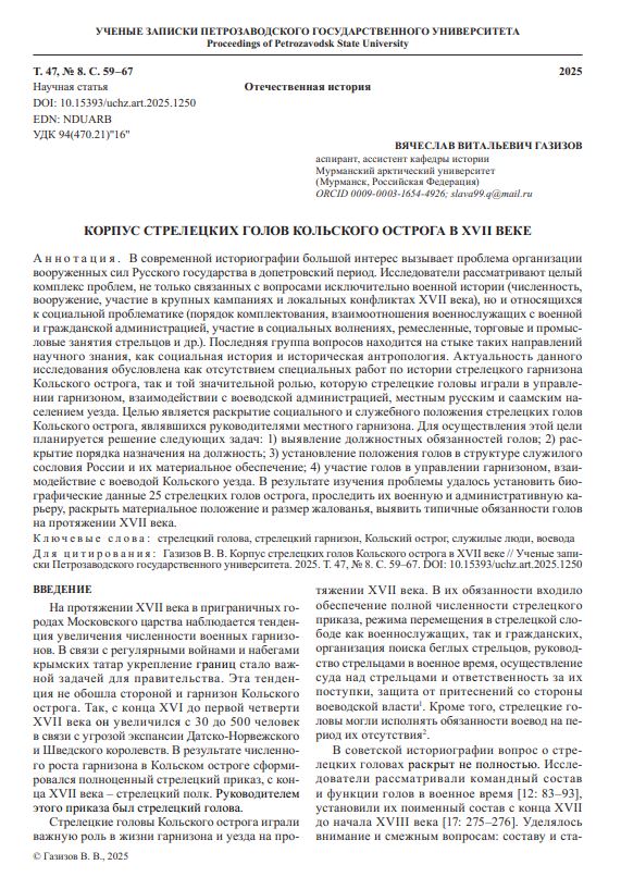 Корпус стрелецких голов Кольского острога в XVII векеКадерова Екатерина Сафаевна