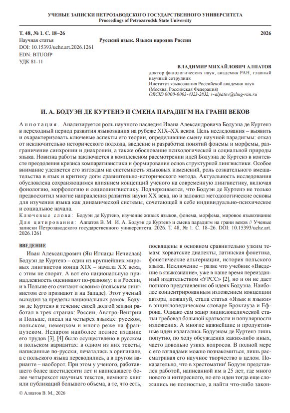 Анализируется роль научного наследия Ивана Александровича Бодуэна де Куртенэ в переходный период развития языкознания на рубеже XIX–XX веков. Цель исследования – выявить и охарактеризовать ключевые аспекты его теории, определившие смену научной парадигмы: отказ от исключительно исторического подхода, введение и разработка понятий фонемы и морфемы, разграничение синхронии и диахронии, а также обоснование психологической и социальной природы языка.