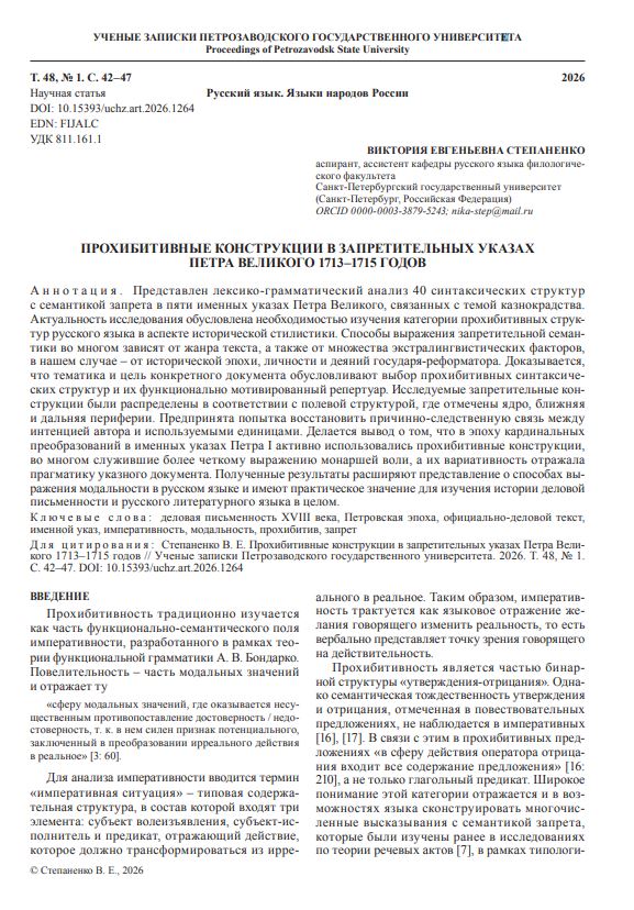 Представлен лексико-грамматический анализ 40 синтаксических структур с семантикой запрета в пяти именных указах Петра Великого, связанных с темой казнокрадства. Актуальность исследования обусловлена необходимостью изучения категории прохибитивных структур русского языка в аспекте исторической стилистики.