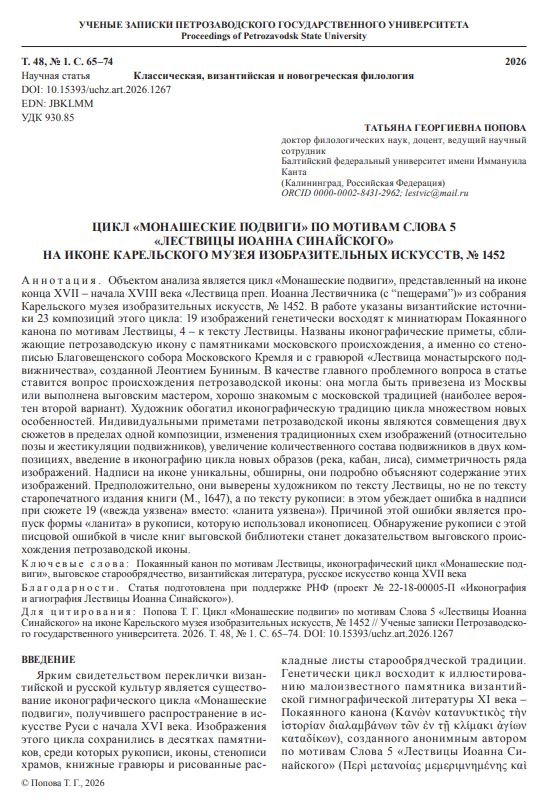 Объектом анализа является цикл «Монашеские подвиги», представленный на иконе конца XVII – начала XVIII века «Лествица преп. Иоанна Лествичника (с “пещерами”)» из собрания Карельского музея изобразительных искусств, № 1452.