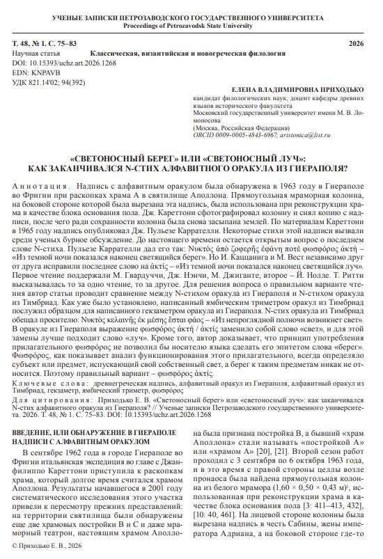 «Светоносный берег» или «светоносный луч»: как заканчивался Ν-стих алфавитного оракула из Гиераполя?Разумовская Елена Александровна