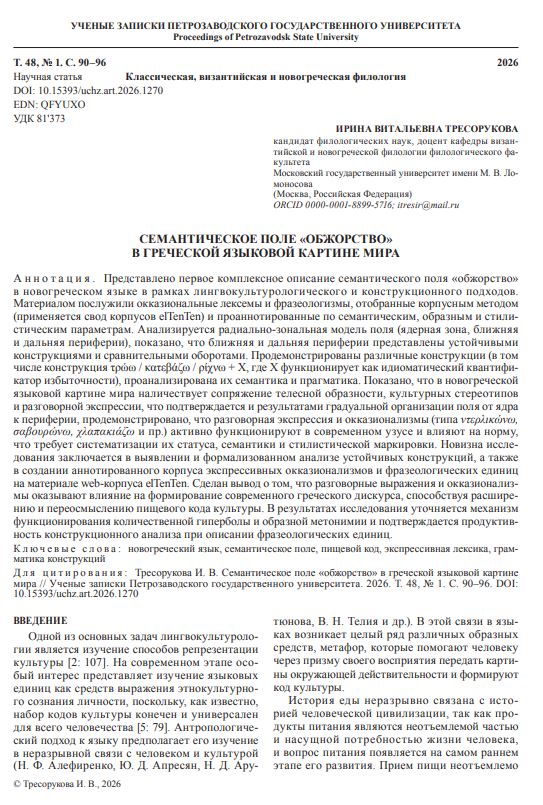 Представлено первое комплексное описание семантического поля «обжорство» в новогреческом языке в рамках лингвокультурологического и конструкционного подходов. Материалом послужили окказиональные лексемы и фразеологизмы, отобранные корпусным методом (применяется свод корпусов elTenTen) и проаннотированные по семантическим, образным и стилистическим параметрам.