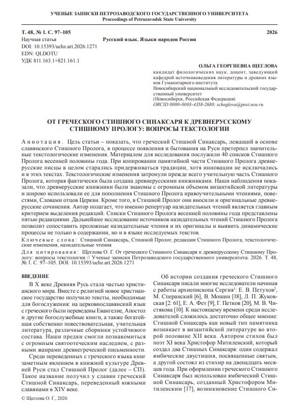 От греческого Стишного Синаксаря к древнерусскому Стишному Прологу: вопросы текстологииЗахарченко Анна Олеговна