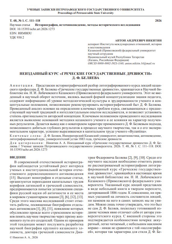 Представлен историографический разбор литографированного курса лекций казанского профессора Д. Ф. Беляева «Греческие государственные древности», хранящегося в Научной библиотеке им. Н. И. Лобачевского Казанского (Приволжского) федерального университета. Этот не введенный в научный оборот источник, являясь высшей формой концептуализации знания педагога, содержит информацию об уровне методологической культуры и эрудированности ученого и концептуальные положения, позволяющие реконструировать историографический быт Д. Ф. Беляева.