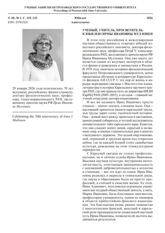 Ученый, учитель, просветитель: к юбилею Ирмы Ивановны Муллонен