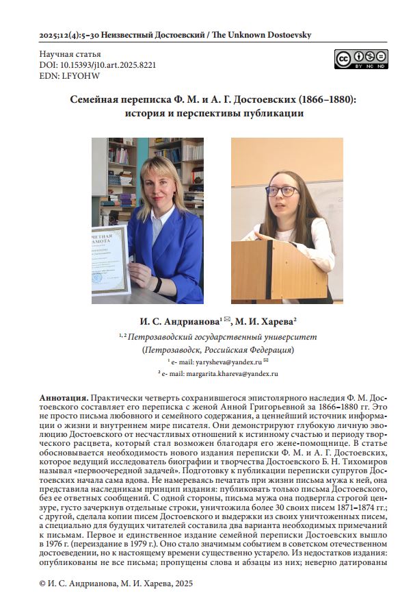 Семейная переписка Ф. М. и А. Г. Достоевских (1866–1880): история и перспективы публикацииПанюкова Татьяна Викторовна