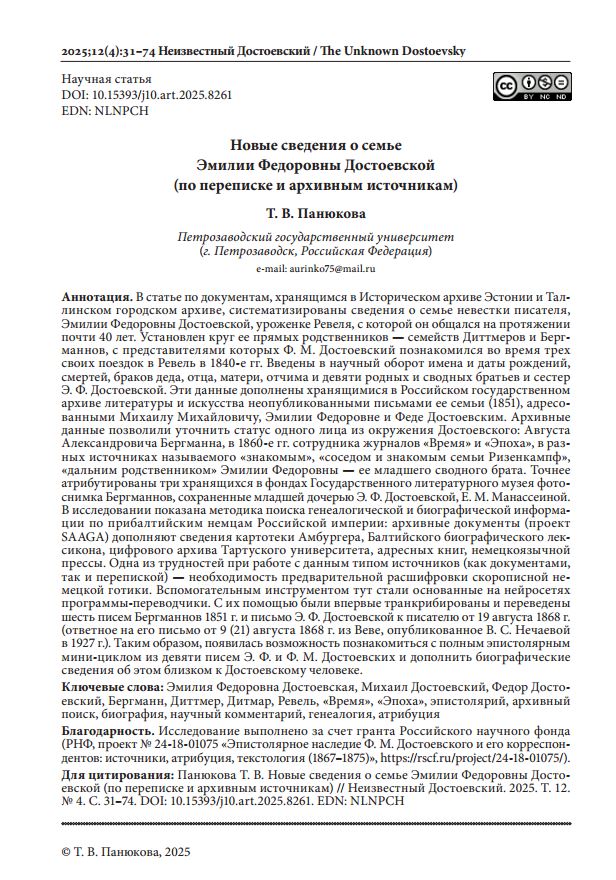 В статье по документам, хранящимся в Историческом архиве Эстонии и Таллинском городском архиве, систематизированы сведения о семье невестки писателя, Эмилии Федоровны Достоевской, уроженке Ревеля, с которой он общался на протяжении почти 40 лет.