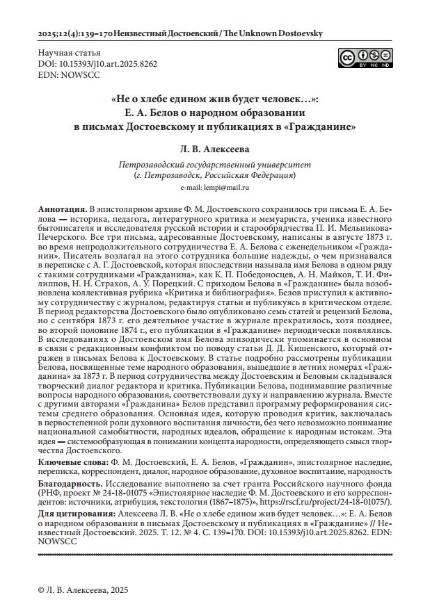 «Не о хлебе едином жив будет человек…»: Е. А. Белов о народном образовании в письмах Достоевскому и публикациях в «Гражданине»