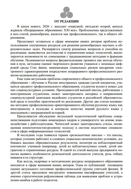 В канун нового, 2026 г. выходит очередной, пятьдесят второй, выпуск журнала «Непрерывное образование: XXI век». Проблематика представленных в нем статей, разнообразна, касается как профессионального, так и общего образования.