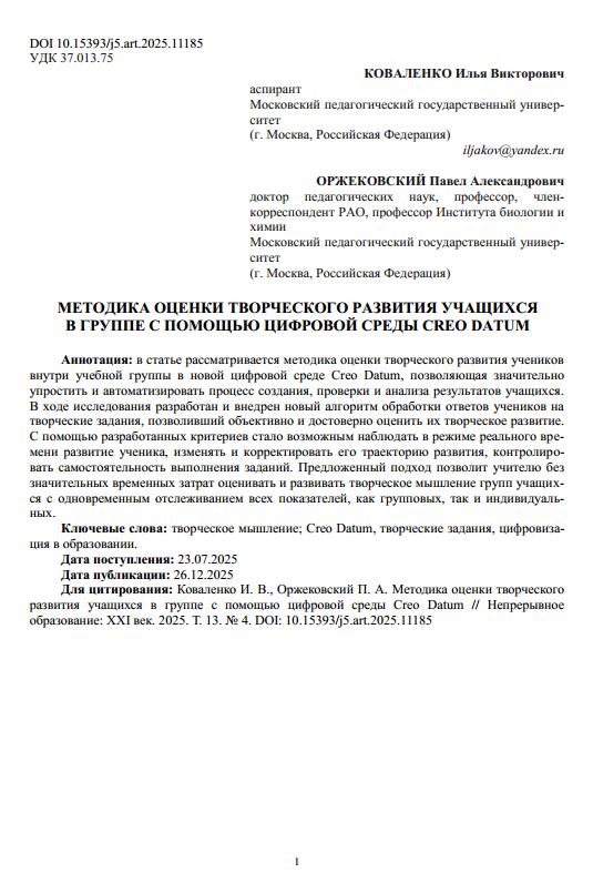 Методика оценки творческого развития учащихся в группе с помощью цифровой среды Creo Datum