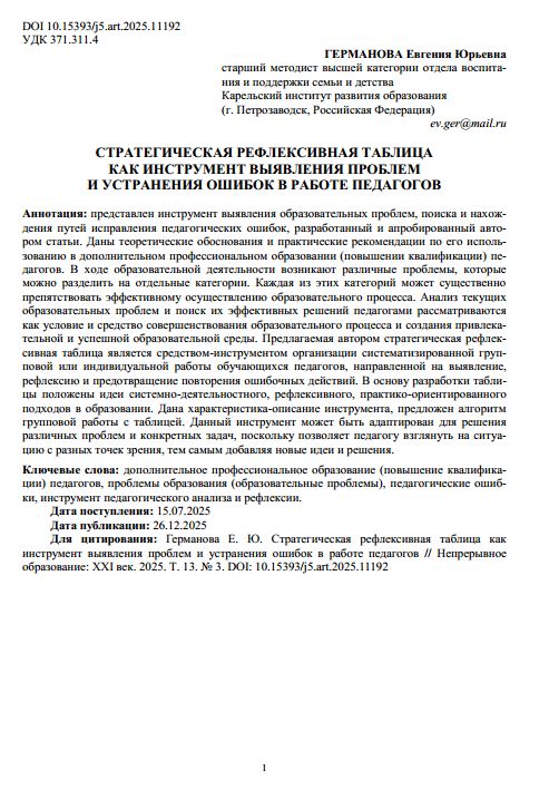Стратегическая рефлексивная таблица как инструмент выявления проблем и устранения ошибок в работе педагоговИгнатьева Галина Александровна, Тулупова Оксана Владимировна