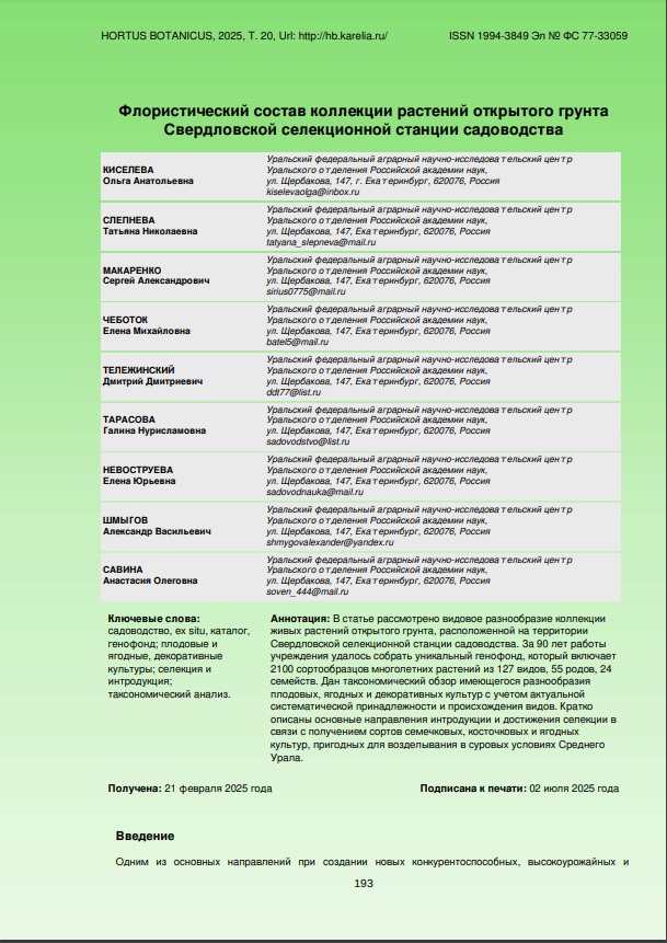 Флористический состав коллекции растений открытого грунта Свердловской селекционной станции садоводстваКириллова Ирина Михайловна, Шакина Татьяна Николаевна, Иксанова Марина Алексеевна, Куликова Людмила Викторовна, Петрова Надежда Андреевна