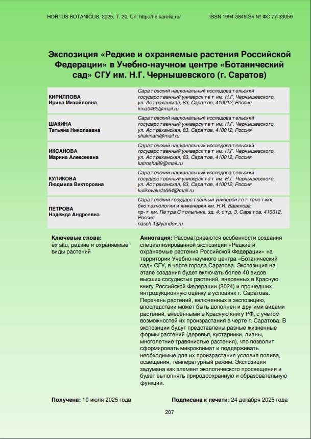 Рассматриваются особенности создания специализированной экспозиции «Редкие и охраняемые растения Российской Федерации» на территории Ботанического сада СГУ, в черте города Саратова. Экспозиция на этапе создания будет включать более 40 видов высших сосудистых растений, внесённых в Красную книгу Российской Федерации (2024) и прошедших интродукционную оценку в условиях Саратова. Экспозиция задумана как элемент экологического просвещения и будет выполнять природоохранную и образовательную функции.