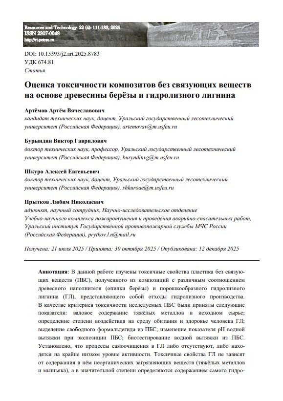 Оценка токсичности композитов без связующих веществ на основе древесины берёзы и гидролизного лигнина