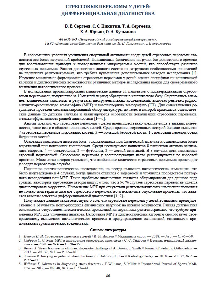 В современных условиях увеличения спортивной активности среди детей стрессовые переломы становятся все более актуальной проблемой. Повышенные физические нагрузки без достаточного времени для восстановления приводят к повторяющимся микротравмам костей, что способствует развитию стрессовых переломов. Ранняя диагностика данного состояния затруднена особенностями проявлений на первичных рентгенограммах, что требует применения дополнительных методов исследования. Изучение механизмов формирования стрессовых переломов у детей, оценка специфики их клинической картины и диагностических возможностей различных методов исследования важны для своевременного выявления патологического процесса.