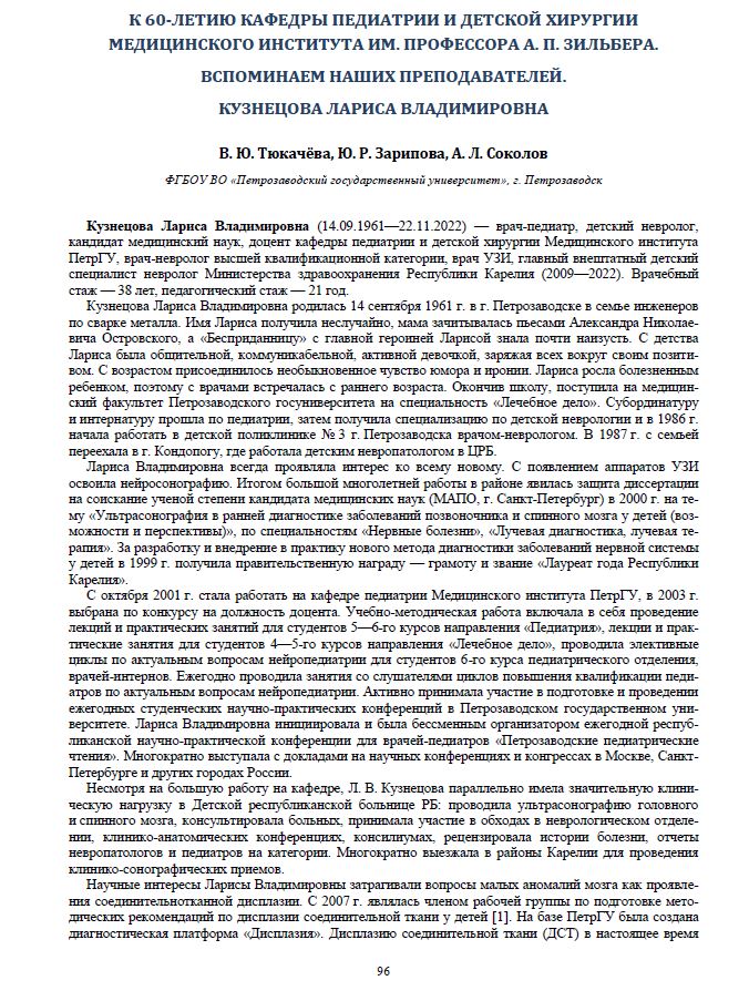 Статья посвящена Кузнецовой Ларисе Владимировне (14.09.1961-22.11.2022) – врачу-педиатру, детскому неврологу, кандидату медицинских наук, доценту кафедры педиатрии и детской хирургии Медицинского института ПетрГУ, врачу-неврологу высшей категории, врачу УЗИ, главному внештатному детскому специалисту неврологу Министерства здравоохранения Республики Карелия (2009-2022).